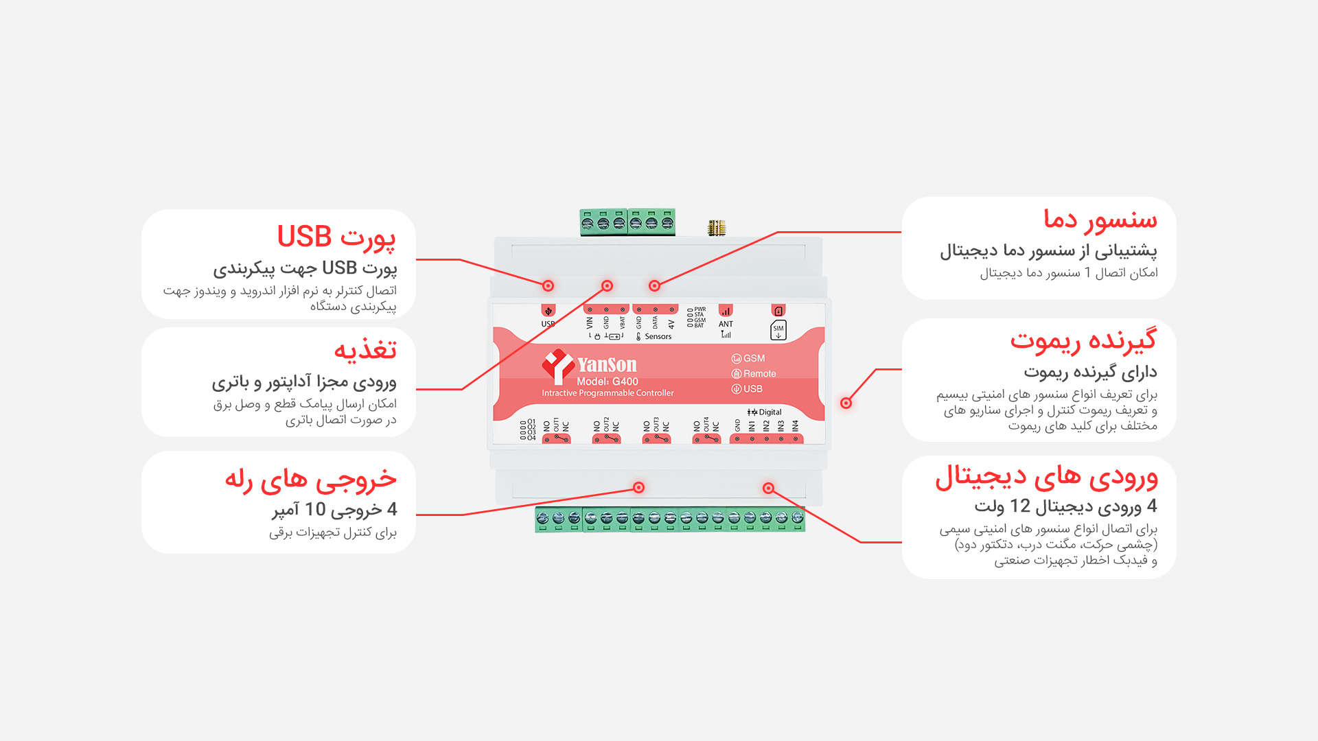 کنترلر هوشمند پیامکی G400 دارای 4 خروجی 10 آمپر و 4 ورودی دیجیتال 12 ولت می باشد و همچنین قابلیت های پیشرفته ای مانند سناریو پذیری , گیرنده ریموت , پشتیبانی از سنسور دما دیجیتال و کنترل از طریق اپلیکیشن را دارا می باشد .
