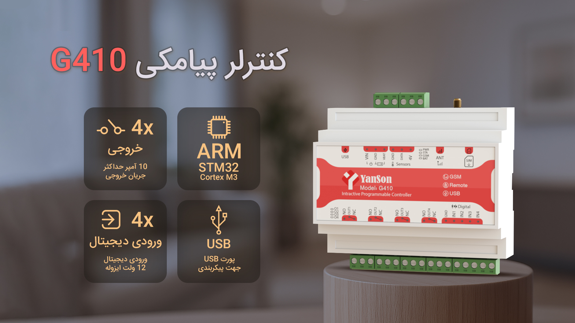 زمانبندی روزانه و هفتگی: قابلیت زمان‌بندی در دستگاه‌های هوشمند یانسون، امکان اجرای خودکار دستورات را در زمان و تاریخ مشخص فراهم می‌کند. این ویژگی باعث صرفه‌جویی در زمان، کاهش خطای انسانی و افزایش بهره‌وری می‌شود. به عنوان مثال، می‌توان سیستم آبیاری گلخانه یا دستگاه تغذیه طیور را به‌گونه‌ای تنظیم کرد که در ساعات مشخصی از شبانه‌روز به‌طور خودکار فعال شوند. این نوع اتوماسیون نه تنها در کاربردهای خانگی، بلکه در کشاورزی، پرورش دام و طیور، و حتی سیستم‌های امنیتی بسیار کارآمد و حیاتی است. سناریو پذیری بالا: کنترلرهای YanSon به لطف سنایو پذیر بودن، امکان اجرای مجموعه‌ای از فرمان‌ها را تنها با یک ورودی فراهم می‌کنند. کاربران می‌توانند چندین خروجی را همزمان خاموش یا روشن کنند، برای هر روخدادی پیامک ارسال نمایند یا اقدامات خاصی را به‌صورت خودکار انجام دهند. این قابلیت، کنترلرهای YanSon را به گزینه‌ای ایده‌آل برای کاربردهای متنوعی چون هوشمندسازی گلخانه، سالن‌های پرورش طیور، خانه‌های هوشمند و اتاق‌های موتورخانه تبدیل کرده است. سناریوها به‌راحتی قابل تعریف هستند و بسته به نیاز، می‌توانند به سرعت فعال شوند. گیرنده ریموت و زون های بی سیم: گیرنده RF در دستگاه‌های یانسون این امکان را فراهم می‌کند که علاوه بر اتصال انواع ریموت کنترل برای روشن و خاموش کردن رله‌ها یا اجرای سناریوهای مختلف، سنسورهای امنیتی بی‌سیم مانند سنسورهای تشخیص حرکت و مگنت‌های درب نیز به دستگاه افزوده شوند. با این قابلیت، راه‌اندازی سیستم‌های هوشمند امنیتی و کنترل تجهیزات بدون نیاز به سیم‌کشی ممکن شده و انعطاف‌پذیری و سهولت استفاده به شکل چشمگیری افزایش می‌یابد. ورودی دیجیتال 12 ولت: کنترلرهای YanSon با داشتن ورودی‌های دیجیتال ۱۲ ولت، امکان شناسایی اتصال یا قطع شدن سیگنال را فراهم می‌کنند. این ویژگی باعث می‌شود بتوان سنسورهای مختلفی مانند چشمی حرکتی، مگنت درب، فیدبک پمپ، یا سوئیچ‌های دستی را به دستگاه متصل کرد. با تعریف فرمان‌هایی مانند روشن یا خاموش کردن خروجی‌ها، ارسال پیامک یا تماس تلفنی، کاربران می‌توانند سناریوهای مختلف امنیتی، نظارتی و کاربردی را به‌صورت هوشمند پیاده‌سازی کنند. پشتیبانی از سنسور های دما و دما رطوبت دیجیتال: پشتیبانی از 4 سنسور دمای دیجیتال و یا 1 سنسور دما روطوبت دیجیتال یکی از ویژگی ها این کنترلر هوشمند می باشد. با نصب سنسور های فوق شما میتوانید دما و رطوبت محیط خود را پایش نمایید. همچنین با تعریف شرط های دما و رطوبت میتوانید خروجی ها کنترلر را با حد بالا و پایین سنسور ها کنترل نمایید و در صورت تجاوز دما و یا رطوبت از حد مجاز، پیامک های اخطاری دریافت نمایید. نرم افزار اندروید: نرم افزار یانسون هاب یک راه حلی کامل برای کنترل و مانیتورینگ تمام پارامتر های دستگاه میباشد. دستور نویسی در نرم افزار بدون نیاز به کد های دستوری و به زبان فارسی می باشد. همچنین نرم افزار یانسون هاب از چندین روش ارتباطی پشتیبانی می‌کند و کاربران می‌توانند تنها با یک لمس، بین کنترل اینترنتی و کنترل از طریق پیامک سوئیچ کنند. طراحی برنامه مدرن، کاربرپسند و قابل شخصی‌سازی میباشد. محتویات محصول: دستگاه کنترل پیامکی G410 آداپتور آنتن GSM
