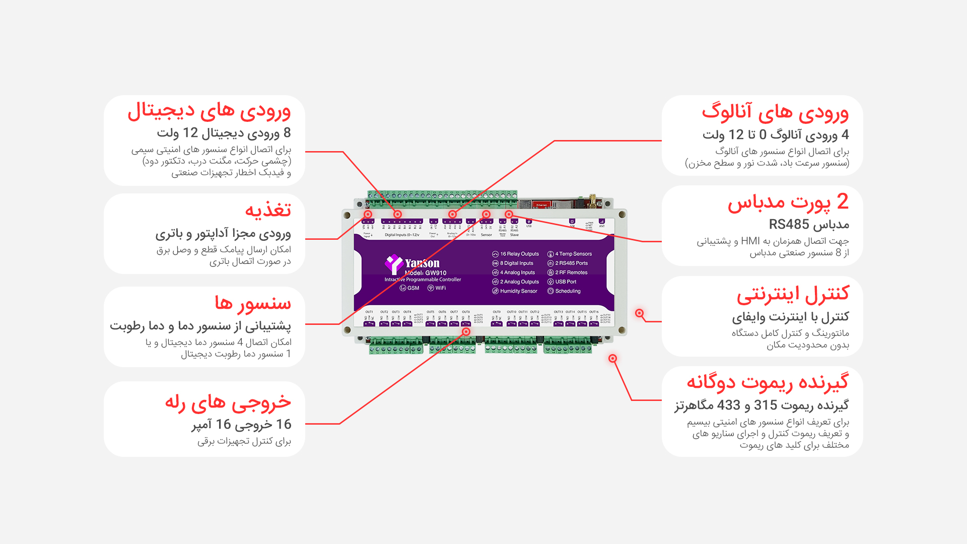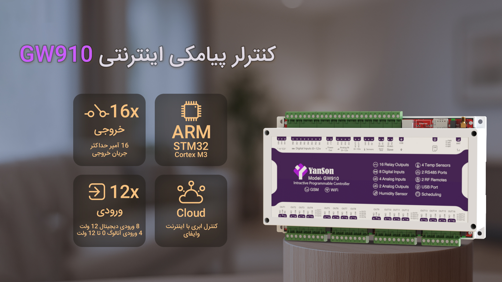 کنترلر هوشمند پیامکی اینترنتی GW910 دارای 16 خروجی 16 آمپر و 8 ورودی دیجیتال 12 ولت و 4 ورودی آنالوگ 0 تا 12 ولت  می باشد و همچنین قابلیت های پیشرفته ای مانند زمانبندی روزانه هفتگی و ماهانه , اینترنت وایفای , سناریو پذیری , گیرنده ریموت , پورت RS485 , پشتیبانی از سنسور دما و رطوبت صنعتی مدباس و کنترل از طریق اپلیکیشن و وب اپلیکیشن را دارا می باشد .