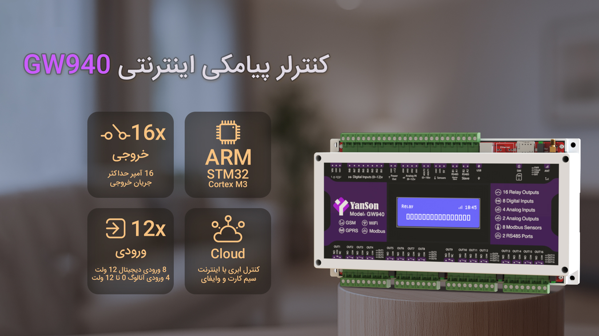 کنترلر هوشمند پیامکی اینترنتی دوگانه GW940 دارای 16 خروجی 16 آمپر و 8 ورودی دیجیتال 12 ولت و 4 ورودی آنالوگ 0 تا 12 ولت  می باشد و همچنین قابلیت های پیشرفته ای مانند زمانبندی روزانه هفتگی و ماهانه , اینرنت سیمکارت و وایفای , منشی تلفنی , سناریو پذیری , گیرنده ریموت دوگانه , پورت RS485 , پشتیبانی از سنسور دما و رطوبت صنعتی مدباس و کنترل از طریق اپلیکیشن  و وب اپلیکیشن را دارا می باشد .