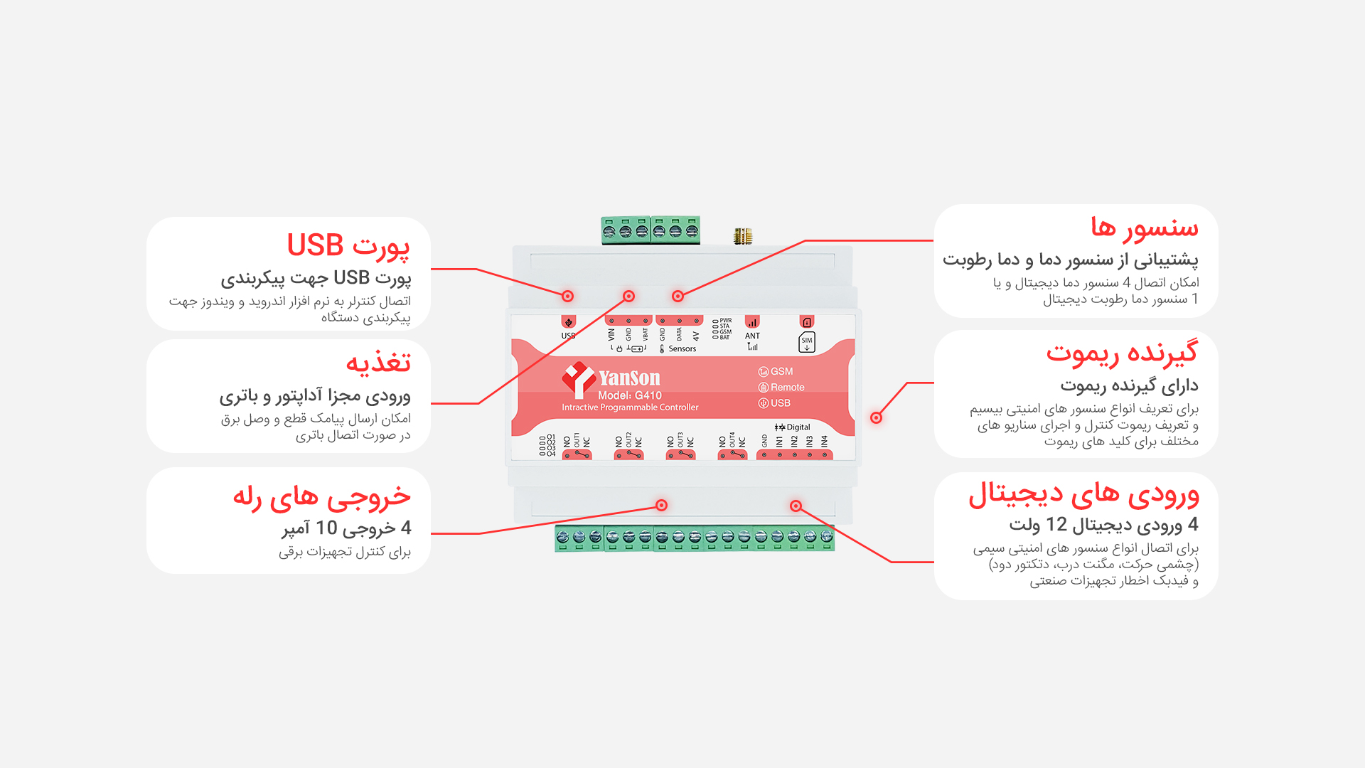 کنترلر هوشمند پیامکی G410 دارای 4 خروجی 10 آمپر و 4 ورودی دیجیتال 12 ولت می باشد و همچنین قابلیت های پیشرفته ای مانند زمانبندی روزانه هفتگی و ماهانه , سناریو پذیری , گیرنده ریموت , پشتیبانی از سنسور دما و رطوبت دیجیتال و کنترل از طریق اپلیکیشن را دارا می باشد .